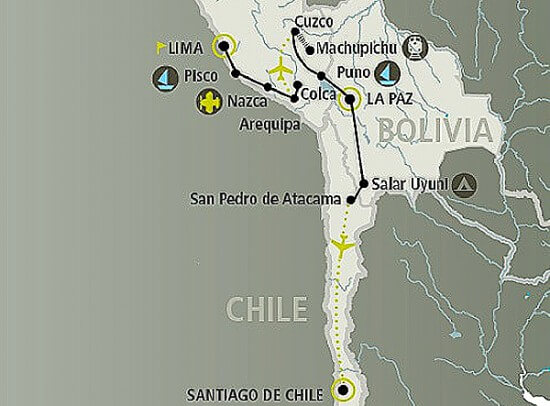 En Perú visitaré Lima y recorreré la hermosa bahía de Paracas en la costa peruana hasta encontrar las enigmáticas Líneas de Nazca. Tras sobrevolar la zona para avistar las figuras a vista de pájaro, seguiremos el viaje y nos detendremos en el Cañón del Colca para observar el vuelo de su protagonista, el Cóndor, el rey de las aves autóctonas andinas. La siguiente parada es la encantadora Cusco, parada obligada para todos los que quieran visitar el Machu Picchu, una de las 7 maravillas del planeta y por supuesto uno de los puntos fuertes de este viaje. Con la visita del Machu Picchu dejaremos Perú, y nos adentraremos en el Lago Titicaca.
